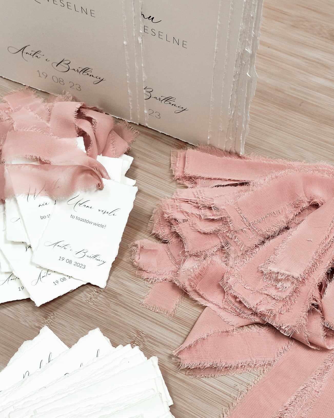 - Wstążkę szyfonową ręcznie rwaną w dowolnym kolorze – długość wstążki, która wystaje poza winietką to około 7.5cm